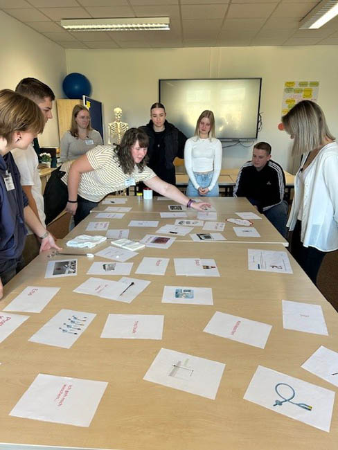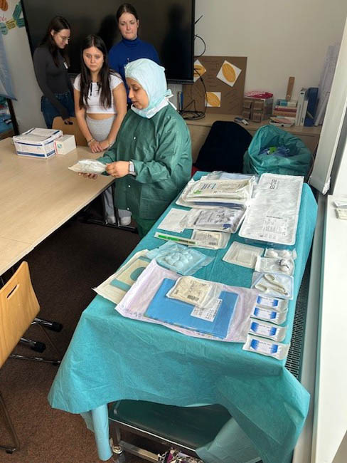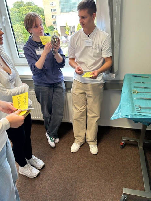 After five weeks of theory, the first-year trainees for operating theatre assistants (OTA) and anaesthesia technicians (ATA) started their careers with a two-day practical project. "Students for students" was organised by the second-year trainees, who actively supported their new colleagues and taught them important basics for their practical work. The "newcomers" were given an introduction to the practical workbook and learnt how to handle typical materials and instruments used in operating theatres and anaesthesia. Terms such as "kick", "little mouse" and "little red riding hood" were also explained to make the technical language of the operating theatre team easier to understand. There were also tips on communication: How do I introduce myself on the first day? How do I make a confident phone call, even if I'm new to the team?