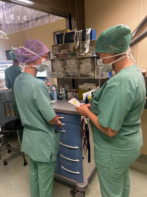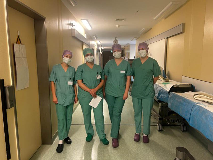 On the second day, we went straight into practice. Under the guidance of the experienced trainees, the "newcomers" practised entering the operating theatre area and hygienic hand disinfection. Together, they got their bearings in the operating theatre and reduced their fear of contact.